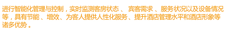 在旅店内展览的珍贵物品下面能够或许装置震撼传感器,一旦有人想用暴力不法的拿走展览品时振动传感器会将信息反应给主机,主机节制警报传感器收回报警,同时告诉办理职员。RoomCenter体系每个客房内均装置一个RoomCenter管家,节制全部房间的装备,下面以总统套房为例。客户进户今后在玄关的墙面下面会有一个画廊,画廊的外面是该房间的节制主机,包含全部房间的统统灯光节制,电视机、空调理制、窗帘节制、扫除房间、订餐、叫办ဣ事生等一系列的旅店办事,房间内另有很多的传感器用来检测该房间的情况到达制动节制的结果。在房间的床头无情形面板,能够或许节制一些简略的情形形式: